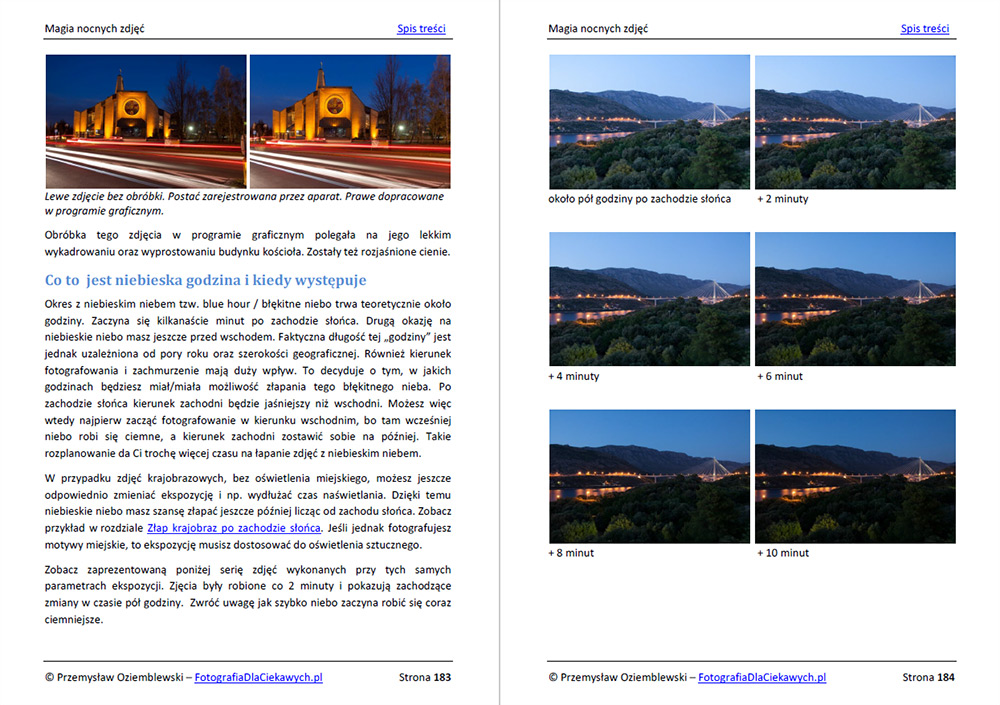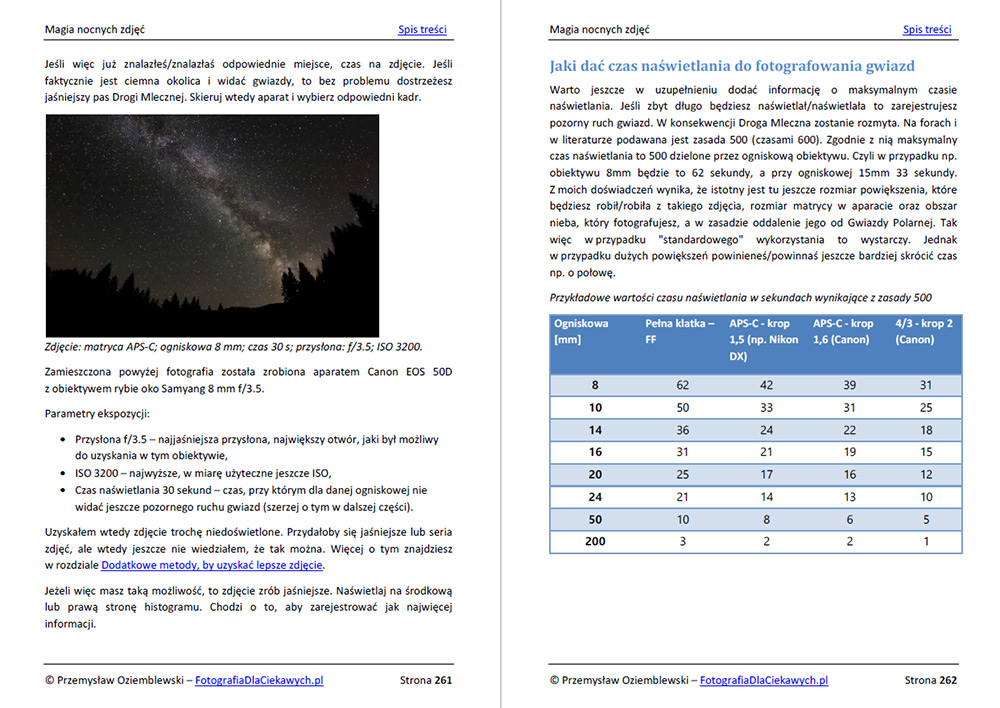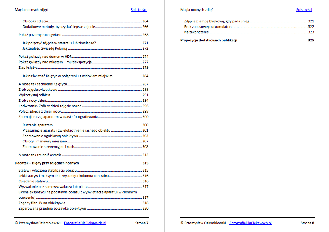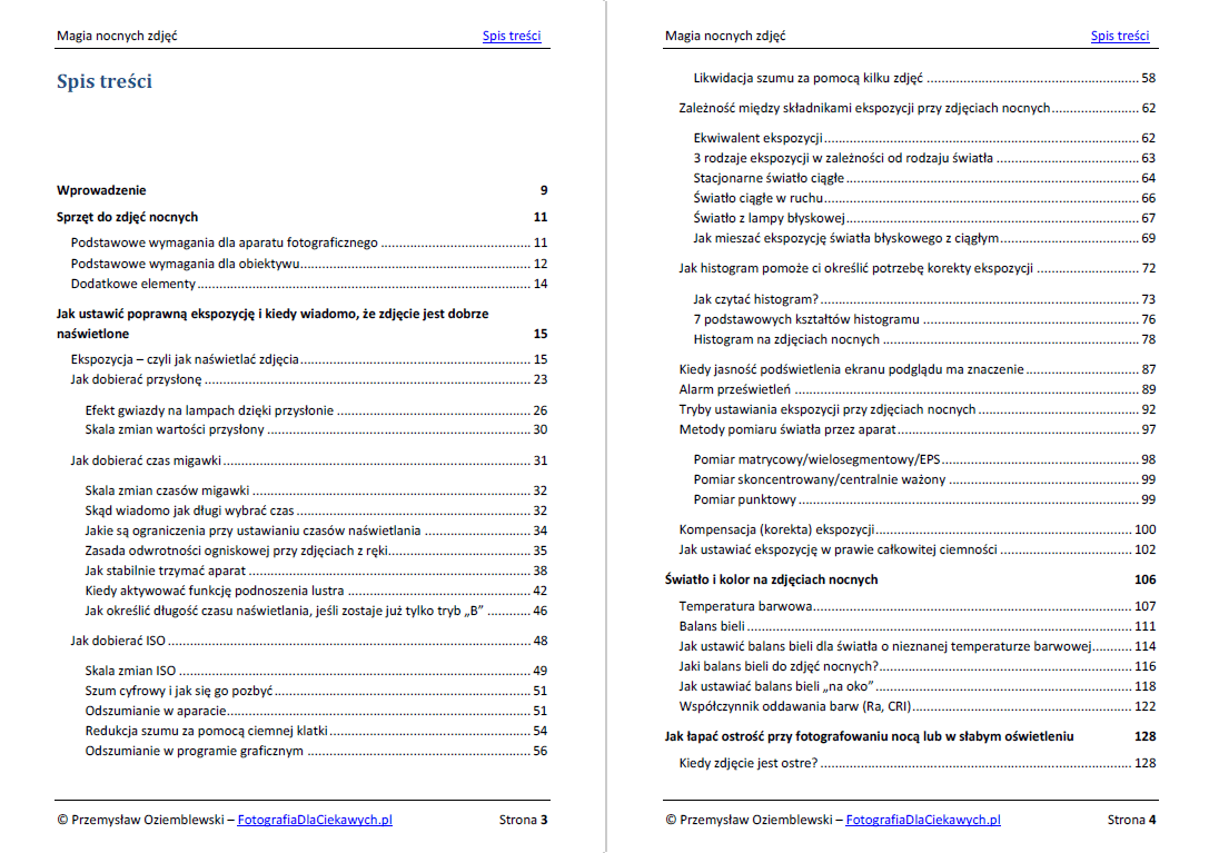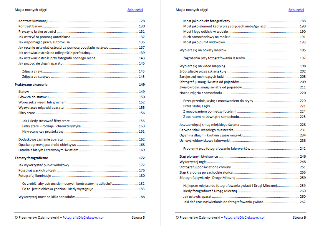 Jest to najbardziej obszerny poradnik, który do tej pory stworzyłem. Zawiera 329 stron ilustrowanych wyjątkowo bogato. Za pomocą zdjęć, grafik starałem się w jak najprostszy i przystępny sposób wyjaśnić wszelkie problemy związane z fotografią nocną. Dlatego w ebooku znajdziesz łącznie aż 474 zdjęć i grafik, które pokazują zależności i efekty, jakich możesz się spodziewać, robiąc samodzielne zdjęcia.